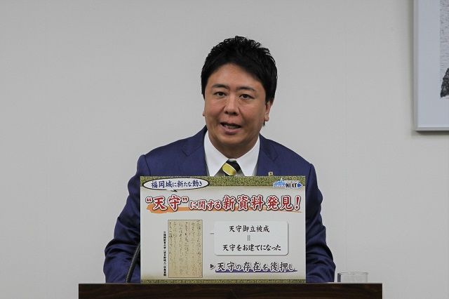 福岡城の天守の存在を後押しするような新しい資料が発見されました。【フリップ】それがですね、こちら映っているものなんですけれども、福岡城の天守についてはですね、商工会議所の懇談会におきます議論、それから議会での質問、それからライトアップのイベントなどを通して、大変、今、関心が高まっている状況にございますけれども、これまでも福岡城に関する資料の収集ですとか、調査を行ってきたんですが、この度、福岡教育大学にある資料の中から、天守が存在したという学説を補強する新たな資料が発見をされたということで、今日は博物館の総館長に同席をしてもらって、専門的な見地から説明をしていただきたいと思っております。