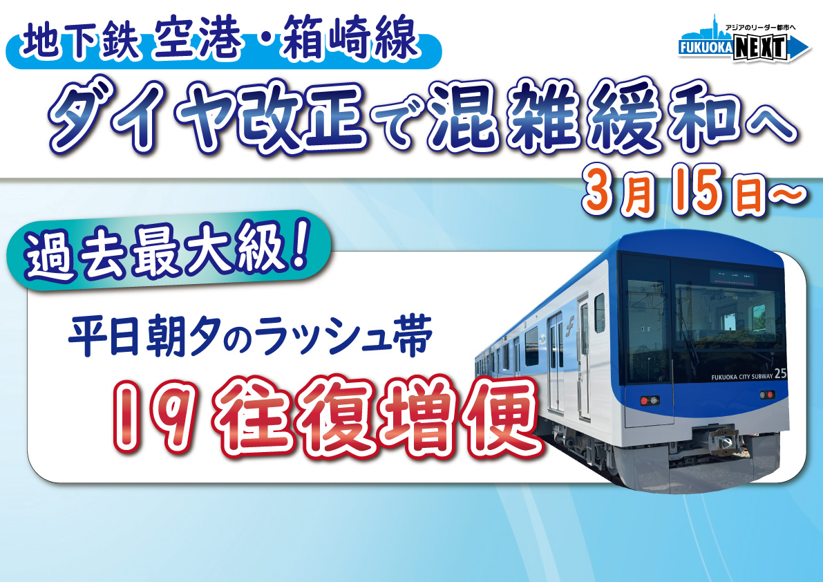 福岡市地下鉄空港線・箱崎線の混雑解消のために、一日往復19便増便をいたします。【フリップ】特に、朝・夕方のラッシュ時に効果があるかなと思われます。