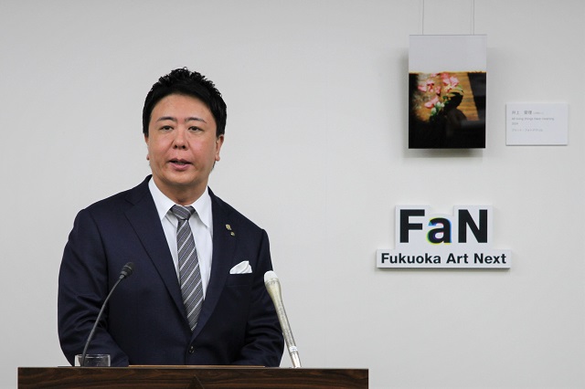 学芸のね、皆さんがプロフェッショナルですけど、こうやって、なんていうかね、今日もカメラありますけど、私を映しても、あんまりなんていうか、大した何の情報もないんで、私が太ったなっていうぐらいしか、大体情報ないんでですね。それよりも後ろに、アーティストの作品があると、それだけでも知っていただくきっかけが増えたらいいなっていう思いで、それで、会見室の後ろと、それから応接室のような露出がある場所に、あえて福岡で活躍しているアーティストさんの作品を置くことによって、この画面の中の情報を増やしていきたいというかですね。せっかくなんで、福岡のこういったアーティストの皆さんの作品を飾るようにしています。