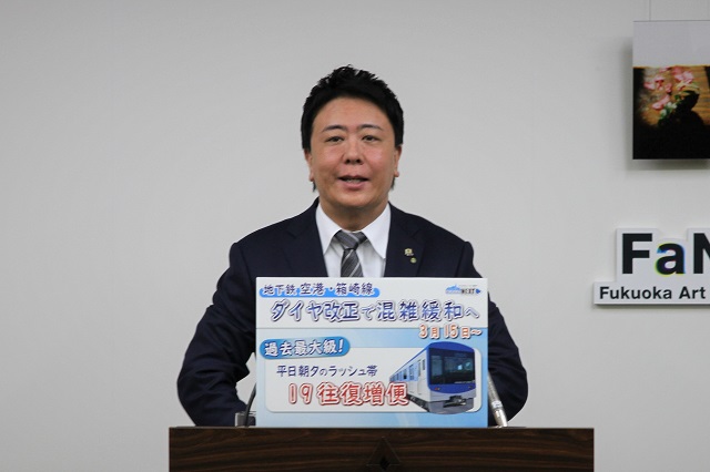 今回の地下鉄の増便の件なんですけれども、今回の空港線のほうは、今回、混雑に向けて対応が行われたということで、一方で福岡市のほうはですね、南から北への線が、西鉄さんとか走っていますけど、そちらもやっぱり人が増えていて、東からの人も増えているという状況があります。そこら辺の政策については、どういうふうに考えてらっしゃるのか、市長のお考えをお願いいたします。