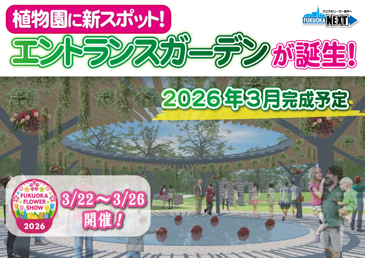 令和8年の3月、つまり来年の3月、福岡市植物園のガーデン、エントランスガーデンが誕生いたします。そしてさらにFukuoka Flower Show2026をこちらの会場で開催をすることにいたします。【フリップ】