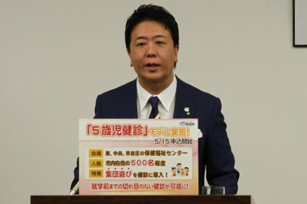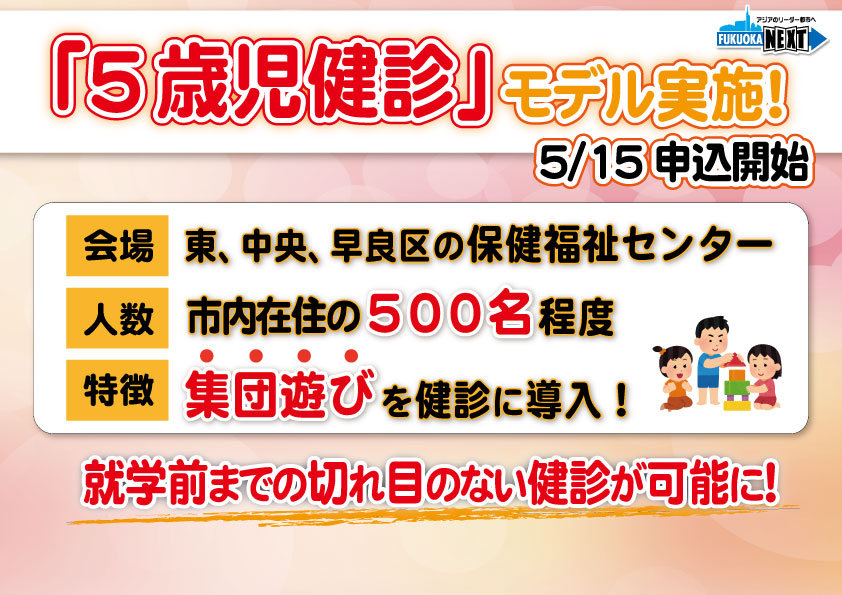 この5歳児健診、これは乳幼児の健診については、福岡市では現在4か月健診、10か月、1歳6か月、そして3歳のタイミングで実施をしているわけでございますけれども、子どもたちの健やかな成長やそれから発達を見守ると同時に、保護者の皆さんが保育士(正しくは、保健師)などへ子育てに関するいろんな相談が小学校入学前のタイミングでできる、そんなチャンスもつくっていきたいというような意図もございます。何で5歳児なのかということなんですけども、ちょうど保育園や幼稚園では年中さんになる時期でして、3歳の頃と比べると随分おしゃべりが上手になったりですね、それから集団の中でルールを守る遊びができるようになったり、それから運動、言語、理解力、社会性、こういう集団の中で生活をするために必要な力というのが急速に発達をする時期なんですよね。今回の健診では、この集団の遊びの様子というものを観察する流れというものを導入していまして、ちょうどその小学校入学前の集団生活の中に入っていく前のこの5歳児のタイミングで、こうしたいわゆる社会性を含めてですね、心身の発達、発育の状況、それから食事や睡眠の生活リズムなどを確認することで、集団生活が増える小学校前の適切な準備ですとか、一人一人の特性に応じたそういった支援につながることも可能になっていくんじゃないかというふうな仮説を持ってございます。ちなみに5歳児健診を実施している自治体は、全国でも1割程度ということで、福岡市は今年度まず市内3ヵ所でモデル実施をして、保護者の意見などもお聞きしながら、最適な方法をこれからも検討していきたいというふうに思ってございます。6月から9月実施分は、明後日5月15日から専用の申し込みフォームで申し込みができるようになってございます。出産後から就学前まで切れ目のない健診によって、引き続き子どもの健やかな成長をしっかりと支えていきたいというふうに考えてございます。