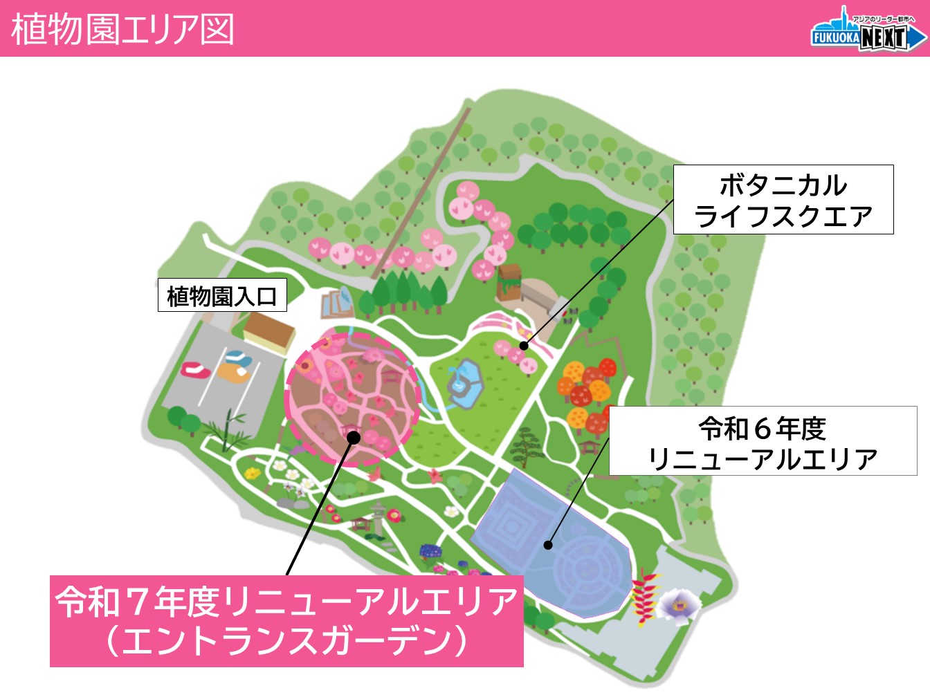 福岡市では、2018年に一人一花運動をスタートいたしまして、市民の皆さん、企業、行政が一体となって「花による共創のまちづくり」に取り組んでございます。植物園というのは、その一人一花運動の拠点として位置づけをしておりまして、一人一花運動、これを始めたくなるきっかけづくりですとか、また誰もが訪れたくなるワクワク感の向上など、この拠点機能の強化に取り組んでいるわけでございますけれども、その一環として、去年からリニューアル工事を進めているところでございます。今日はですね、今年度のリニューアルで誕生する、これからどうなっていくのかというイメージをモニターを使ってご紹介をしたいというふうに思いますので、イメージを膨らませていただければと思います。