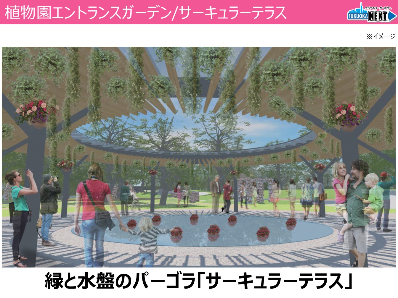 まずは、エントランスガーデンの場所なんですが、これはもう正面から入ってすぐのエリアになります。【モニター①】植物園にお越しになった全ての方をまず最初にお迎えをする場所でございまして、ここからさらに奥、ボタニカルライフスクエアがある芝生広場ですとか、今年の3月に開催をしたFukuoka Flower Show Pre-Eventの会場、そして温室などに続くエリアともなります。今回新しくリニューアルをするこちら、緑と水盤のパーゴラ「サーキュラーテラス」。【モニター②】こちらがですね、植物園で最初に目に入る緑と水盤のサーキュラーテラスとなります。直径が16メートルという円形のパーゴラの下に、深さ3センチの水盤がございまして、パーゴラを飾る花や緑、それから周りの樹木というのがこの水面に映ると、こういう造りになっているんですね。ここにこうぶら下げたり、また水盤に置く花や緑、これは季節ごとに変化をいたしまして、植物園の新たな顔となるスポットにしたいなと思っておりますので、ここに来て写真とかを撮っていただければと思います。そして、その奥には、バラと草花のガーデンを整備をいたします。【モニター③】ここには植物園のバラ園で大切に育ててきたバラをはじめ、300種、600株のバラを中心として、四季を感じられるおよそ100種類、1万株の草花と一緒に彩っていきたいと思ってございます。そして、誰もが写真を撮りたくなるようなバラのアーチ、バラのウォールなど、写真映えもするスポットもたくさん設置をしたいなと思っています。【モニター④】さっきのサーキュラーテラスとも併せて、立体的に飾られた花や緑というのを一年中いつでも楽しめるエントランスガーデンが誕生するということになります。このエントランスガーデンの誕生は、来年の3月を予定してございます。