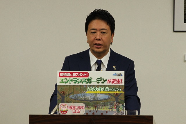 この新たな見どころが誕生した植物園において、Fukuoka Flower Show2026を開催をいたします。来年3月はですね、この新しくなった植物園でのフラワーショーの開催に合わせて、天神や博多駅のエリアでもチューリップロードや、そしてまた民間ビルの入り口の花装飾などで、今年以上に福岡の街を花いっぱいにしていければと思ってございます。ぜひ、楽しみにしていただければと思いますし、この時期になるとですね、またそのときに改めて言いますけども、ぜひ、例えばちょっと花柄を入れた服とかね、小物とか、もう街全体で花で楽しめる、そんなフラワーショーの機会になればいいなというふうにも思ってございます。これが1点目のお話です。