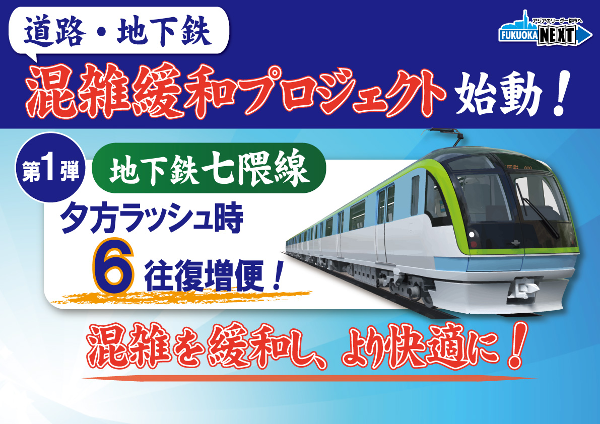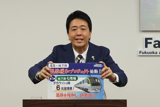 まずは第1弾として、七隈線の夕方ラッシュ時の増便でありますけれども、福岡市地下鉄、これまでも渋滞緩和のために増便などを行ってきたわけですけれども、今回は七隈線の夕方17時から19時、ちょうど仕事終わりで帰る時間帯ですよね。もしくは、学生さんたちの学校終わりということですけども、既存の車両をとにかく最大限活用して6往復増便をしたいと思います。これによって現在120%程度になっている夕方の混雑率を最大で100%程度にまで低減できるんじゃないかと考えてございます。