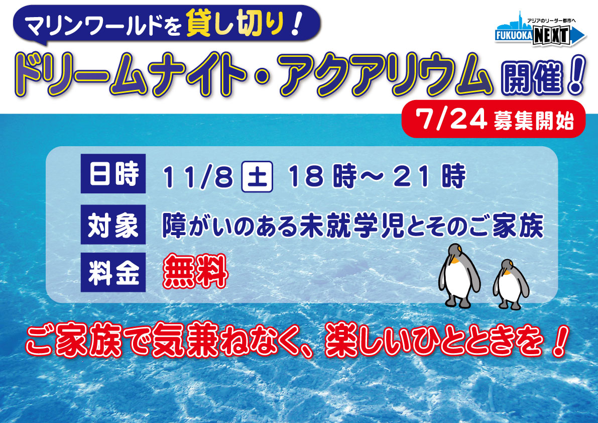 じゃ、次いきます。貸し切りのマリンワールド海の中道で、障がいのある未就学児の子どもたちに、楽しいひと時を過ごしていただこうという「ドリームナイト・アクアリウム」こちらを開催をしたいと思います。【フリップ】
