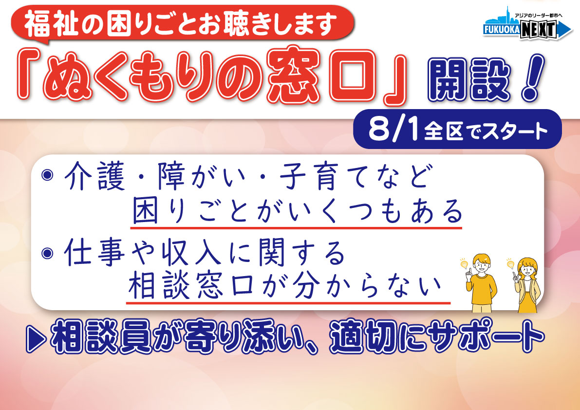 このぬくもりの窓口、実は去年の8月に、博多区役所で先行してオープンをしていて、さまざまな相談を受けていて。まずは、先行事例でいろんなことが検証できた中で、ついに来月からは全ての区での開設になるということでございます。