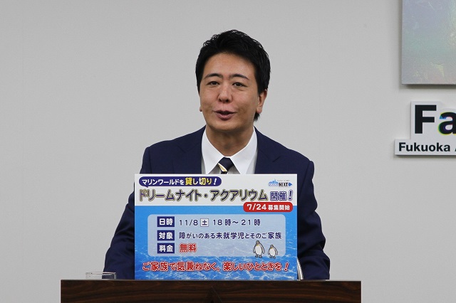 今回、ドリームナイト・アクアリウムと言っていますが、この「ドリームナイト・○○」という企画自体が、実はグローバルなイベントでして、もともとはオランダの動物園で、障がいのある子どもたちを招待をした「ドリームナイト・アット・ザ・ズー」という、そういうものが発祥でして、そこから世界に広がった事業というものでして、福岡市としては、障がいがあることを理由とした体験格差が生じないような取り組みもしてみようという中の第1弾というかですね、ということで、まずは水族館で初めて開催をしようというのが、今回の企画でございます。