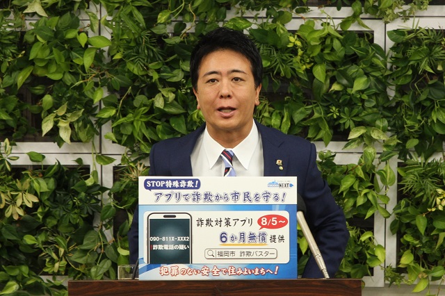 現在こういう社会課題がある中で、このような形でコラボレーションできますよという、そうしたことの情報を、その窓口からいただいて、それで福岡市としては担当である市民局のほうで、さまざまなこういった特殊詐欺をどう防ぐかということについては、県警などとも連携をしていたわけですけれども、その取り組みの一つに組み込んでご協力をいただいて、今回のアプリを使った詐欺被害防止の取り組みをするということになったのが経緯でございます。