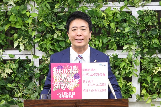 「Fukuoka Flower Show2026」このような国際水準のガーデンコンテストのほか、福岡らしさということで、集合住宅率日本一というですね、こういう福岡事情を加味してですね、ベランダのコンテスト、また季節の花々による装飾なども行いたいと考えています。