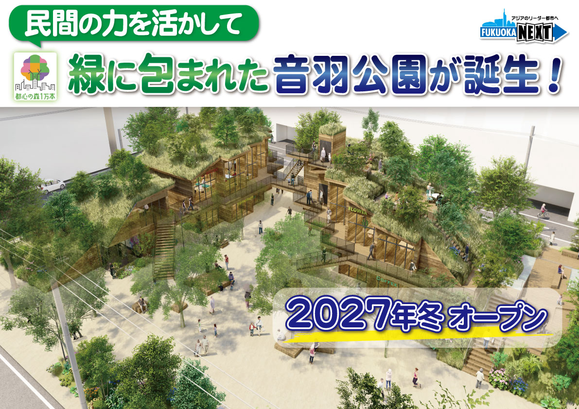福岡市としては、この制度を活用した公園づくりとしては、今年の4月に供用を開始をした東平尾公園、そして続いて清流公園、明治公園、香椎浜北公園、長垂公園(正しくは、長垂海浜公園)と、次々にオープンに向けた取り組みを進めておりますけども、今回は博多区のこの音羽公園について、優先交渉権者が決まったんで、どういう公園に生まれ変わるのかという特徴をですね、また、こちらもちょっとモニターを使ってお知らせをしたいと思います。