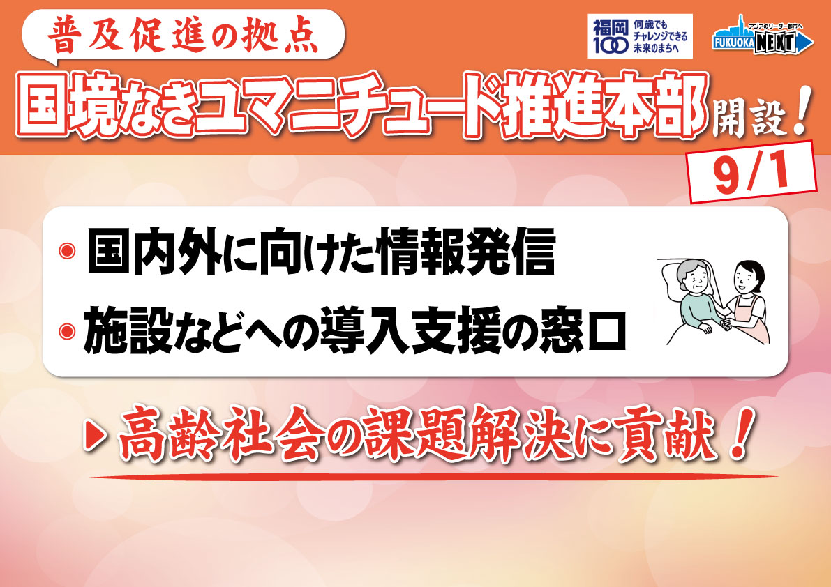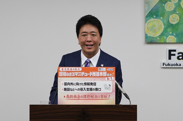 ユマニチュード、もう言葉として覚えていただいた方も多いかと思うんですけれども、ユマニチュードというのは、「見る」、「話す」、「触れる」、「立つ」という4つの動作を基本とした認知症の方とのコミュニケーション、これをスムーズにするケア技法の一つでありまして、40年以上前にフランスで生まれたものでございます。2018年に世界の他都市に先駆けて、このユマニチュードの取り組みを福岡市ではスタートしたわけですね。2023年には、ユマニチュードを考案したフランスの団体などと一緒になって、世界の自治体の中でも唯一ですね、国境を越えてユマニチュードを推進しようという「国境なきユマニチュード憲章」に署名をいたしました。今回ですね、そのユマニチュードの国際的な普及啓発の拠点となるこの国境なきユマニチュード推進本部を、福岡市に今日から開設をされることになったということでございます。これによって、フランスですとか、日本のユマニチュード学会における最新の知見ですとか、ノウハウ、それから世界の他都市のですね、ユマニチュードの実践の様々な事例などがこの福岡市に集まってくるようになりますので、これを市民の皆さんにどんどん還元をしていきながら、これから特に高齢化というものが日本において一気に進んでいくわけですけれども、こうした部分に寄与する、そういった施設になればと思ってございます。