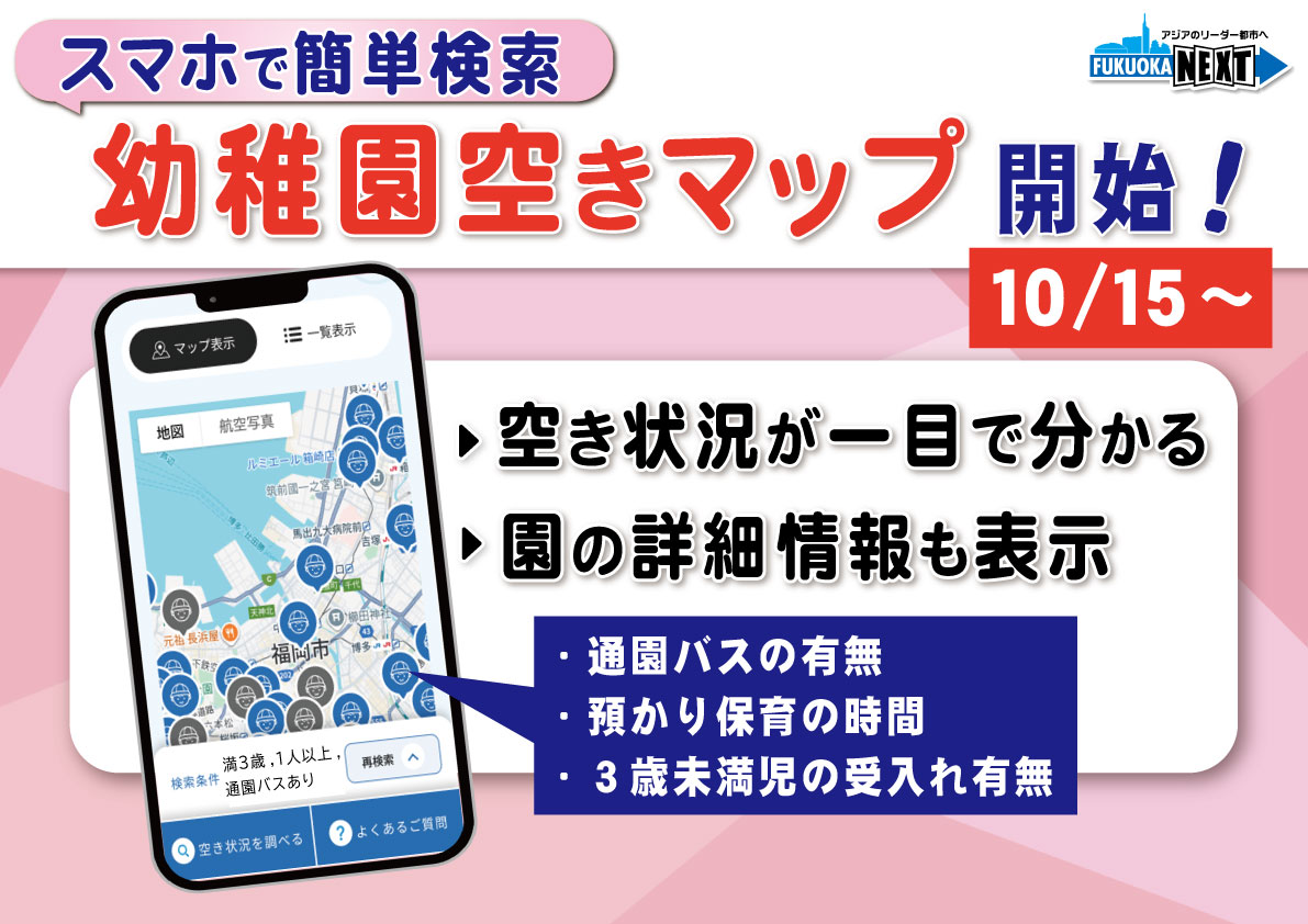 福岡市では、スマホで幼稚園の空き状況ですとか、預かり保育の状況などが分かる「ふくおか幼稚園空きマップ」のサービスを開始いたします。【フリップ】