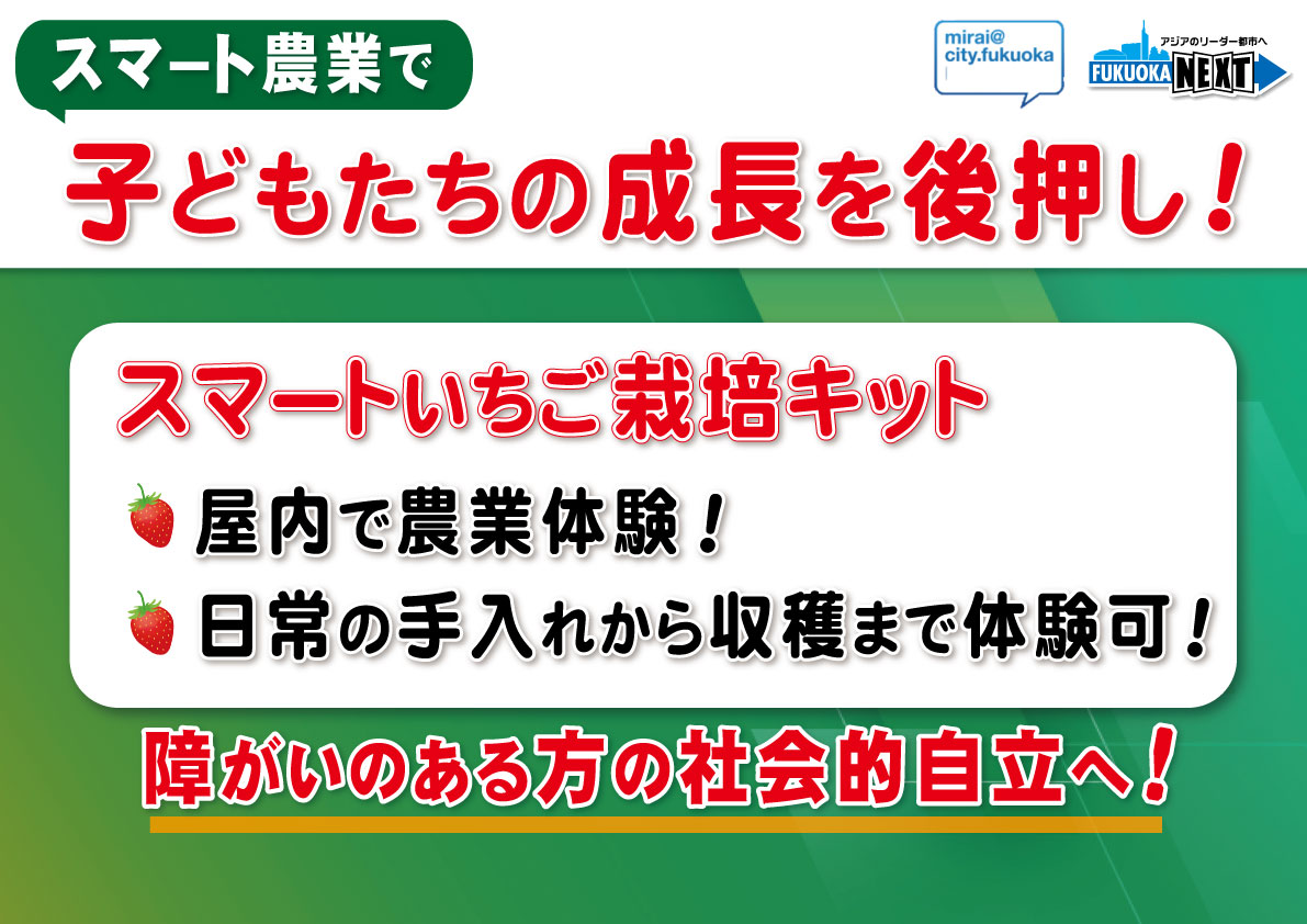 はい。福岡市では、スマート農業を通して、障がいのある子どもたちの自立に向けて、意欲とやる気を喚起するような、そんな新しい取り組みをスタートをいたします。【フリップ】