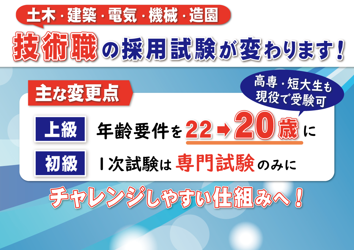 このほかにもですね、技術系の高校生にとって負担の大きかった初級技術職の教養試験の廃止、それから事務職以外の論文試験の廃止も併せて行うこととしておりまして、専門性を重視しつつ、今までよりも受験しやすい採用試験制度に変わるということでございます。制度変更後の最初の試験の申し込みというのは、今度の3月となります。
