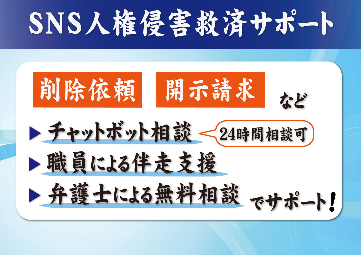 一方で、個人がそのような被害に遭ったというときにですね、どうしたらいいかって分かんないですよね、個人の場合ね。そうしたSNSなどで誹謗中傷などの人権被害を受けた方を対象として、新たな相談窓口を設けたいと思います。具体的には、チャットボットでのネット相談窓口を設けるほか、削除依頼などの手続きというのを伴走支援しながら、そして案件に応じて、無料の弁護士相談にもおつなぎをしていこうというものでございます。