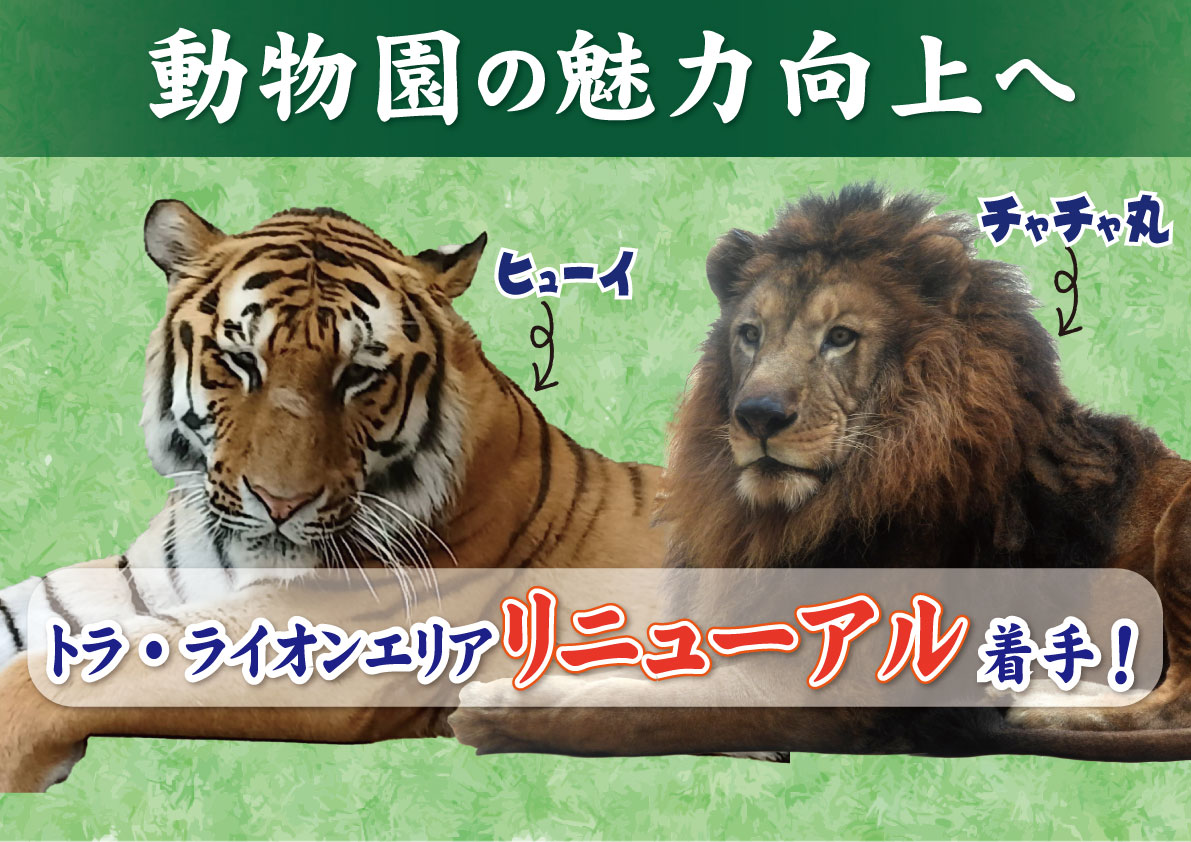 続いて、動物園の話に行きたい。ゾウに続いて、トラとライオンのエリアもリニューアルをしてまいります。【フリップ13】去年ね、去年じゃない、もう一昨年になるのかな、ゾウさんがね、福岡市にようやくやって来てくれて、しかも坂とかね、自然に近い環境の中で、ゾウさんが伸び伸びと生活をしている様子を見ることができるようになったと思いますけれども、続いてはですね、トラとライオン、そのエリアについても同じようにリニューアルをしていきたいと思っております。