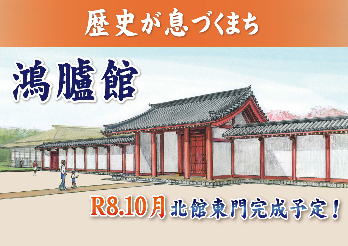 そこの今、復元整備をしていて、北側、北館(ほっかん)の東門の復元が、今年の10月に完了をいたします。さらにですね、貴重な遺構とか出土品、こうしたものを間近でご覧いただける展示館についてもリニューアルを進めていて、来年3月にオープンをこちらもする予定でございます。