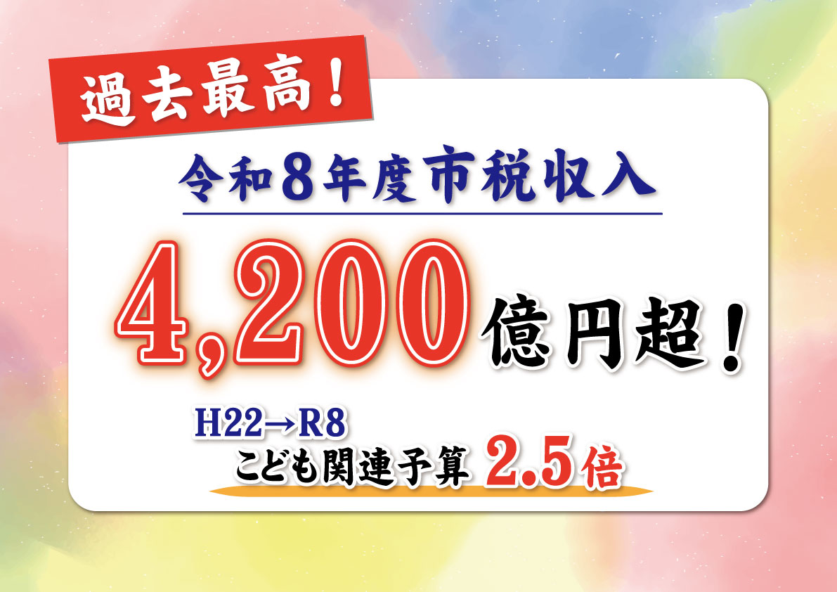 当時、2010年に、私、就任したときが2,600億円台でしたから、16年前から、およそ1.6倍近く増えておりまして、1,600億円増加する見込みでございます。こうして、これまでもこう、増えてきた税収の財源を使ってですね、例えば保育所の整備とか、おむつと安心定期便とか、それから、学校の普通教室、特別教室、さらには体育館も含めてエアコンの整備を進めるとかですね、こうしたかたちで、こうした増えてきた税収で市民生活の質の向上に振り向けてきた。