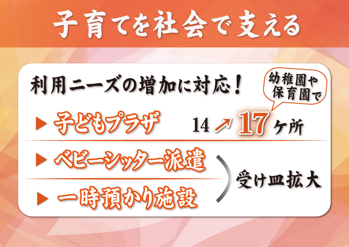 それから続いて、子育てをみんなで支え合う仕組みづくりにも取り組みます。【フリップ4】まずは、子どもプラザなんですけれども、子どもプラザというのは、乳幼児家庭の身近な集える場所、また、子育ての悩みですとか、情報交換できる場所なんですけれども、ニーズが大変増えてきているということもあるので、市内14ヵ所ある子どもプラザを3ヵ所増設をして、親子が気軽に集える居場所づくりをしたい。