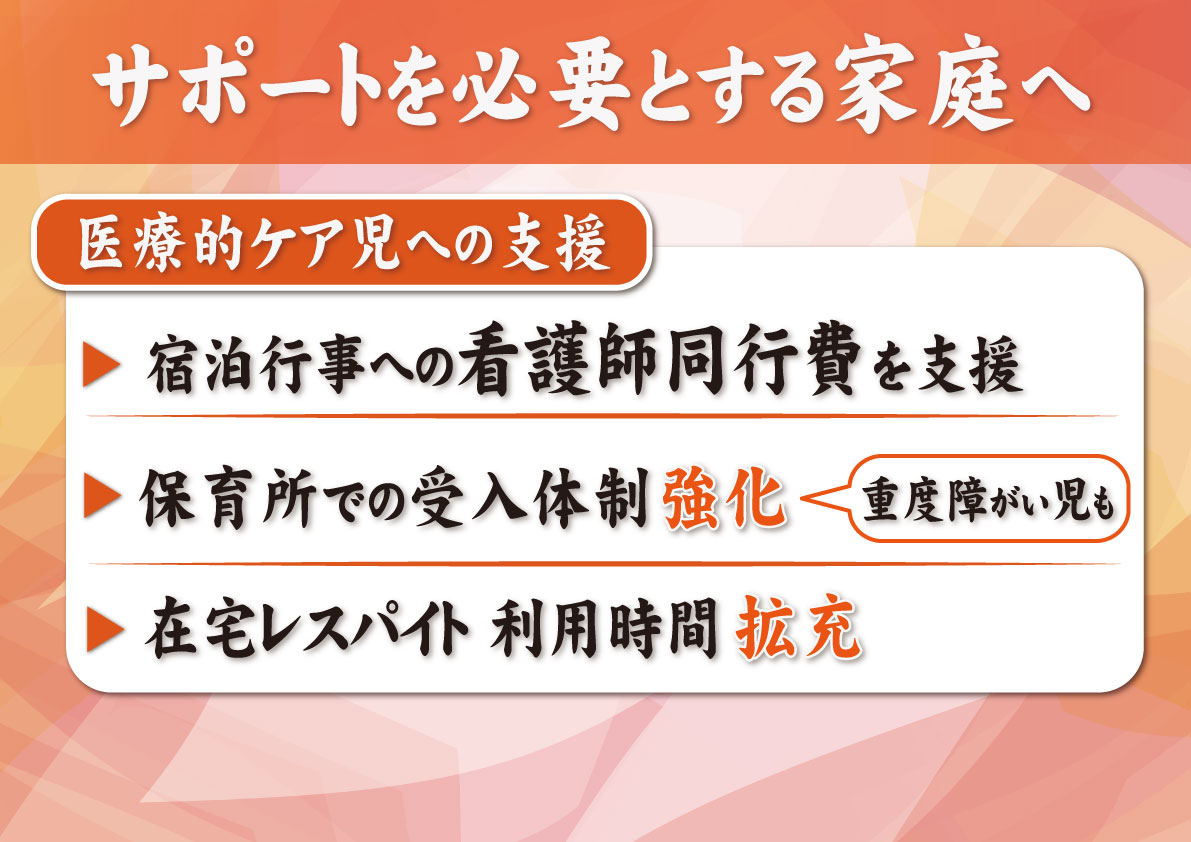 続いては、続いて、サポートを必要とするご家庭への支援について、新年度ですね、しっかりと充実をしていきたいと思っております。【フリップ5】
