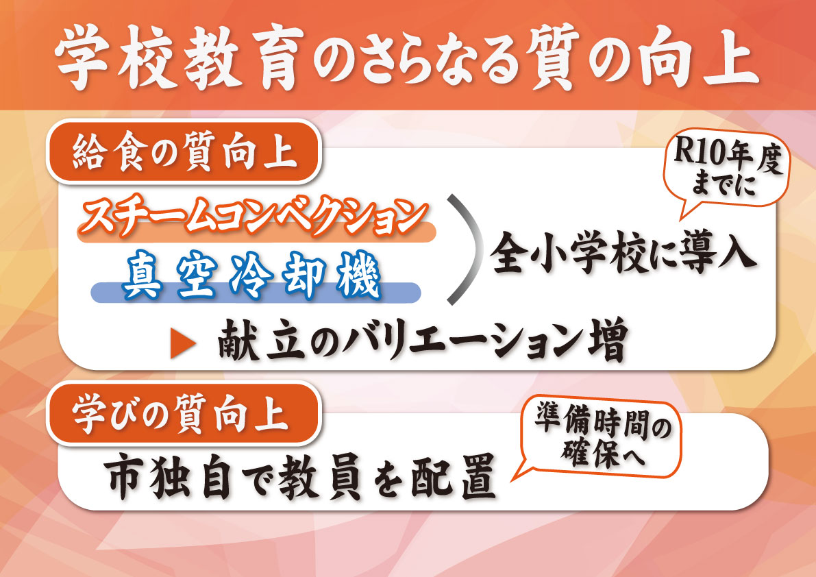 それから、「もっとおいしい給食プロジェクト」というものを、教育委員会が立ち上げをしておりまして、その後、総合教育会議で教育委員会の皆さんとの意見交換の場でも、私も直接、ご要望・陳情を受けましてですね、品数を増やしたりするためにも、これはスチームコンベクションオーブン、それから真空冷却機、こういったものが導入されると、焼いたり蒸したりする料理が提供できるようになるとか。それから、2品のおかずを3品に増やせるとか、とにかくハードの整備が必要なんだということを、直接、総合教育会議の場でご要望いただきましたので、100%そのご要望に市長部局としても予算面で応援をしたいということで、令和10年度までに146校すべての小学校に、これらの機器を導入するということで、しっかり支援をしていきたいと思っております。
