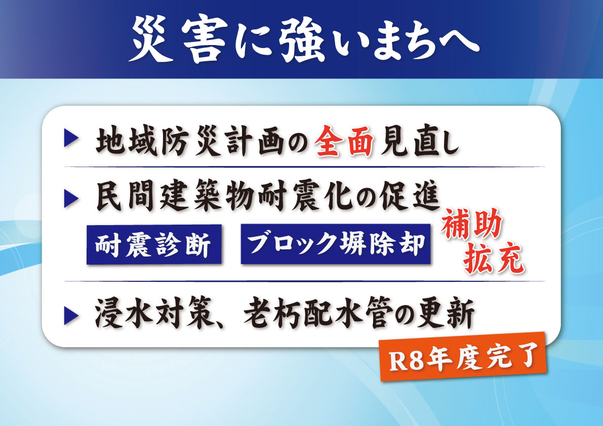 それから、民間の建築物の耐震化も促進をします。特にですね、建築物の耐震の診断費、これはですね、補助対象、用途や規模にかかわらず、すべての建築物に拡大をしますし、それから道路に面しているブロック塀、これについて除去する場合には、補助率をこれまでの2分の1から3分の2に引き上げて、さらに補助の上限額も15万円から30万円に増額をして、こうした危ないブロック塀の撤去の、早期に除去するということにも取り組んでいきたいと思っております。