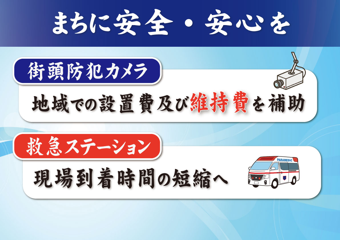 そして続いて、こちら、安全・安心でいくと、まちの安心・安全、市内で設置をしている防犯カメラ、これまではイニシャルコスト、つまり導入費に補助をしていたんですが、これからはランニング、つまり維持管理費にも助成をしていきたいと思っております。さらには、救急車が到着する時間を短くする、こんな取り組みも行ってまいります。【フリップ9】