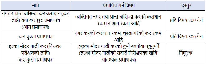 बसोबास योग्यता (भिसा) नवीकरण गर्दा क्षेत्रीय अध्यागमन सेवा ब्यूरोलाई आफ्नो "वैयक्तिक नगर तथा प्रान्त बासिन्दा कराधान प्रमाणपत्र (खाजेइ स्योउमेइस्यो)" वा "कर चुक्ता प्रमाणपत्र (नोउजेइ स्योउमेइस्यो)" पेस गर्न आवश्यक हुन सक्छ। गएको सालको आम्दानीको स्वघोषणा नगरेको व्यक्ति "कराधान प्रमाणपत्र (खाजेइ स्योउमेइस्यो)" पाउन सक्दैनन्। "कराधान प्रमाणपत्र (खाजेइ स्योउमेइस्यो)" पाउनको लागि आफ्नो आम्दानीको स्वघोषणा गर्नुहोस्। गएको सालको खुद आयको जानकारी भएको कागजात (गेन्सेन च्योउस्युउ ह्योउ आदि) लिएर वडा कार्यपालिका कार्यालयमा गएर स्वघोषणा गर्नुहोस्। तपाईँको करको रकम निर्धारण गरी कर तिरिसकेपछि "कर चुक्ता प्रमाणपत्र (नोउजेइ स्योउमेइस्यो)" प्राप्त गर्न सक्नुहुन्छ।