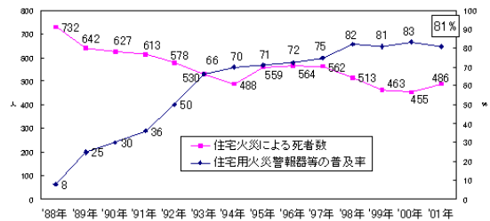 住宅用火災警報器等(日本の普 及率は1割程度)について,その設置の有無で見た住宅火災100件当たりの死者数は,設置なし: 6.1人 → 設置あり: 1.8人となっている。(平成14年データ)
