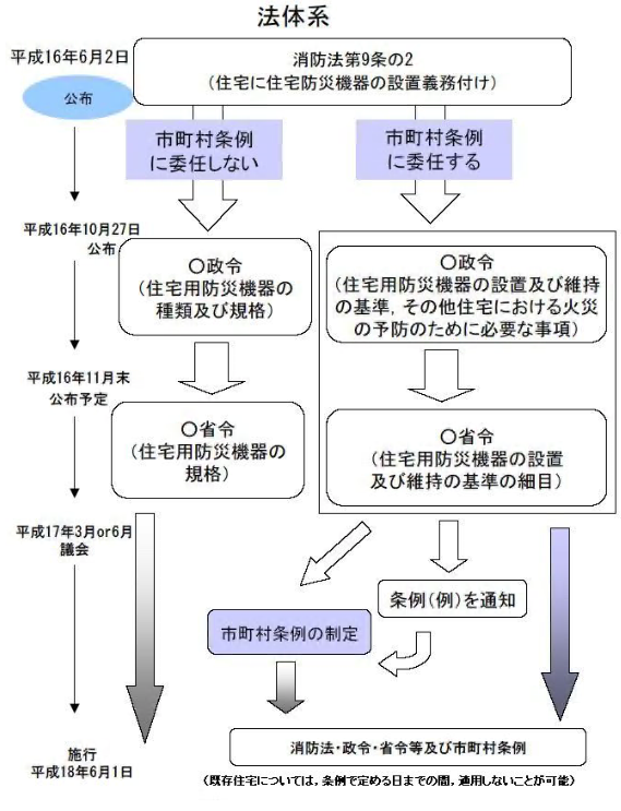 第2条この条例の施行の際,現に存する住宅における同条各号に掲げる住宅用防災警報 器若しくは住宅用防災報知設備又は現に新築,増築,改築,移転,修繕若しくは模様替えの工事中の住宅に係る住宅用防災警報器等が新条例第29条の2から第29条の5ま でに規定による住宅用防災警報器等の設置及び維持に関する基準に適合しないときは、,当該住宅用防災警報器等については,平成21年5月31日までの間,これらの規定は, 適用しない。