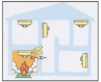 | 火災により発生する煙を感知し,家の中に居る者に対し,音又は音声などの警報音を発する機器であり,一般的に,感知部及び警報部が一つの機器である。 | 火災による煙を自動的に感知し,火災信号を直接又は中継器を介して受信機に送信し,火災の発生場所の表示及び警報を発す る機器で,一般的に,感知器,中継器及び受信機で構成される機器である。 |