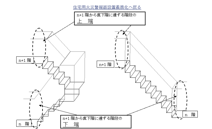 (1) 令第5条の7第1項第1号イに揚げる住宅の部分が存する階(避難階(建築基準法施行令(昭和25年政令第338号) 第13条の3第1号に規定する避難階をいう。次号において同じ。)から上方に数えた階数が2以上である階に限る。)から下方に数えた階数が2である階に直上階から通ずる階段(屋外に設けられたものを除く。以下同じ。)の下端(当該階段の上端に住宅用防災警報器又は住宅用防災報知設備の感知器(火災報知設備 の感知器及び発信器に係る技術上の規格を定める省令(昭和56年自治省令第17号。以下「感知器等規格省令」という。)第2条第1号に規格するものをいう。以下「感知器」という。)が設置されている場合を除く。