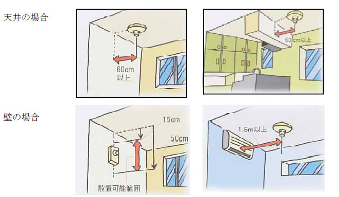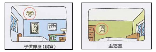 2 住宅用防災警報器は、天井又は壁の室内に面する部分(天井のない場合にあっては, 屋根又は壁の屋内に面する部分。この項において同じ。)の次のいずれかの位置に設置しなければならない。