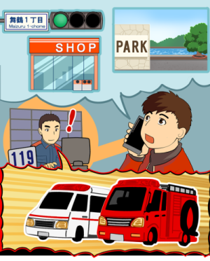 消防車,または救急車が必要な場所が分かれば,すぐに向かわせることができます。 If the fire service or an ambulance know where there is an emergency they can arrive sooner! 一旦掌握地址,消防车或救护车便可立即启动,赶赴现场。 소방차나 구급차가 필요한 장소를 알 수 있으면, 신속하게 출동할수있습니다. 住所が分からなければ,交差点,コンビニ,公園など目印になるものを教えて下さい。 If you don’t know the address of your emergency,give details of surrounding landmarks such as crossings, convenience stores or parks etc. 如无法告知地址,请告知周围醒目的参照物,如十字路口,便利店,公园等。 주소를 모르는 경우에는 교차점, 편의점, 공원 등 랜드마크가 될 수 있는 장소를 알려 주십시오. |