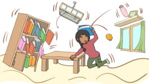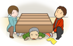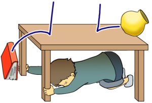 テーブルの下などに隠れ,身を守る! Shelter under something to protect yourself. 躲在桌子等下面,确保人身安全! 탁자 아래로 들어가 몸을 보호한다. |