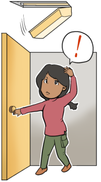 窓や戸を開けて出口の確保をする。逃げる時は慌てずに! Open windows and doors to secure an escape route. Evacuate calmly. 打开门窗,确保出口畅通,随时可以避难。避难时千万不要慌张! 창이나 문을 열어 출구를 확보한다. 피난은 침착하게! |